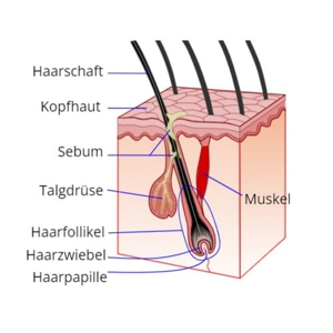 Jedes Haar am Körper ist gleich aufgebaut. Es besteht aus einem Haarschaft und einer Haarwurzel. Der sichtbare Haarschaft wächst nach außen, während die Haarwurzel tief in der Unterhaut (Subcutis) steckt. Sie wird umhüllt vom sogenannten Haarfollikel, der das Haar in der Kopfhaut verankert.
